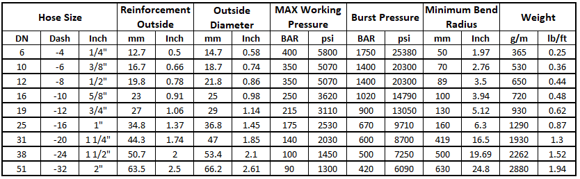 CONTINUOUS SERVICE TEMPERATURE RANGE -40 °F /  212 °F -40 °C / 100 °C MAX OPERATING TEMPERATURE 125 °C, 257 °F TUBE Oil resistant synthetic rubber REINFORCEMENT One high tensile steel braid COVER Synthetic rubber with high ozone, weather and heat resistance. APPLICABLE SPECS Exceed EN 853 2SN; SAE 100 R2AT; ISO 1436 2SN/R2AT